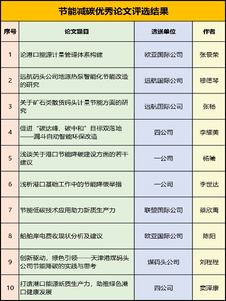 股份公司積極響應習近平總書記“發展新質生產力”的重要論述要求,組織開展2024年度節能降碳征文活動。各所屬單位在“雙碳”背景下,將新質生產力與節能降碳工作相結合,圍繞“促進新能源、新技術的運用與開發,加快港口能源結構轉型速度,推動天津港綠色港口建設高質量發展”等方面進行深入研究,最后經過專家組評選出了10篇文章榮獲優秀論文獎。