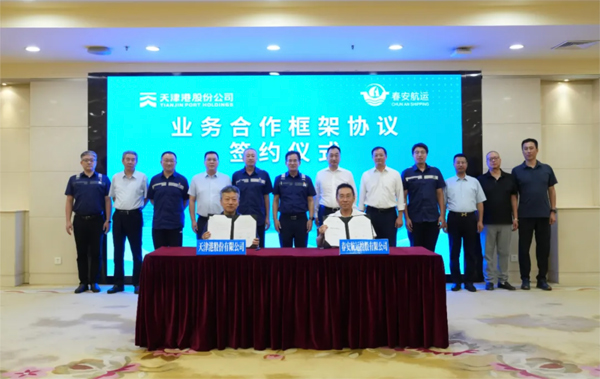 日前,天津港股份有限公司與春安航運控股有限公司簽署業務合作框架協議,雙方將立足現有合作基礎,在市場開發、精品航線打造、促進貨源集聚等領域延伸合作,深化港航協同,打造互利共贏的合作新模式,助力天津港世界一流港口建設,共同打造我國北方地區聯通國內國際雙循環的重要戰略支點,共繪港口經濟高質量發展新藍圖。